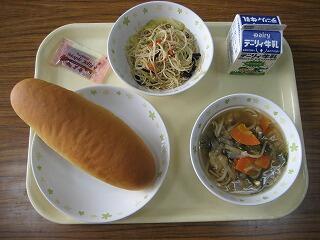 本日のメニューは、コッペパン、牛乳、メープルシロップ、炒めビーフン、チンゲンサイのスープでした。