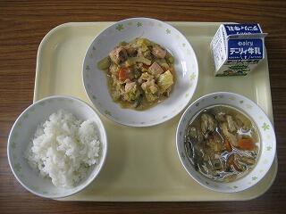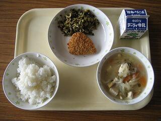 本日のメニューは、ご飯、牛乳、カボチャ挽肉フライ、高菜とちりめんの油炒め、切干し大根のみそ汁でした。