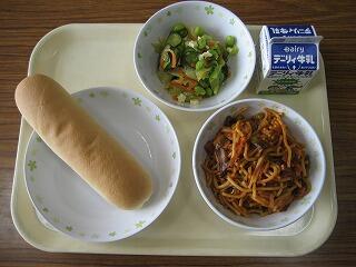 本日のメニューは、減量米粉パン、牛乳、ナポリタンスパゲティ、青豆とチーズのサラダでした。