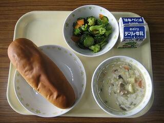 本日のメニューは、黒糖パン、牛乳、コーンチャウダー、フレンチサラダでした。