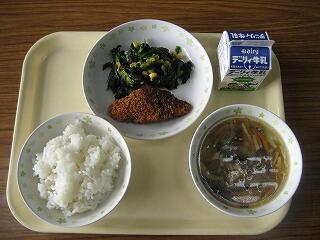 本日のメニューは、ご飯、牛乳、マグロカツ、菜の花和え、五目スープでした。