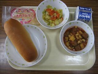 本日のメニューは、チーズパン、牛乳、ミートボールと豆のトマト煮、野菜のガーリックソテー、お祝いクレープでした。