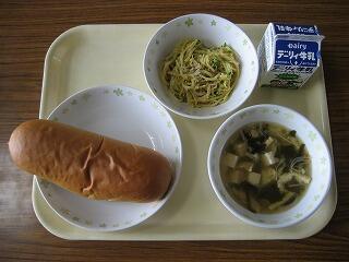 本日のメニューは、減量コッペパン、牛乳、県産日向夏ミカンのジャム、ズッキーニのスパゲティ、ほうれん草のツナサラダでした。