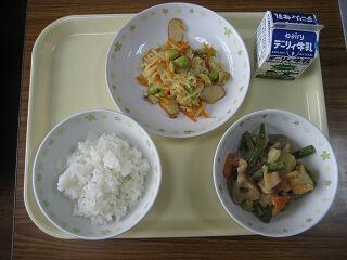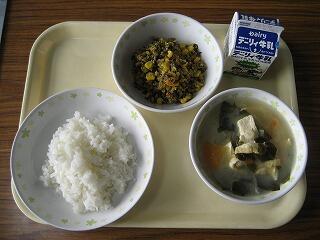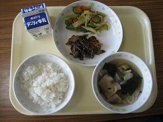 本日のメニューは、ご飯、牛乳、根菜の味噌煮、切干し大根炒めでした。
