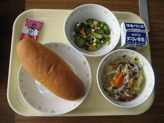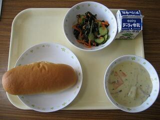 本日のメニューは、コッペパン、牛乳、サツマイモのシチュー、海藻サラダでした。