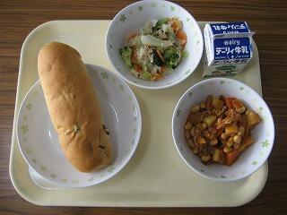 本日のメニューは、レーズンパン、牛乳、ポークビーンズ、フレンチサラダでした。
