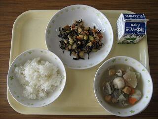 本日のメニューは、ご飯、牛乳、大豆とジャガイモの磯煮、豚汁でした。