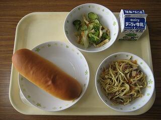本日のメニューは、減量チーズパン、牛乳、和風スパゲティ、いなりサラダでした。