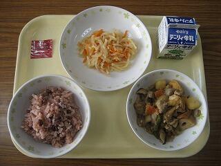 本日のメニューは、赤飯、牛乳、一食ごま塩、筑前煮、紅白なますでした。