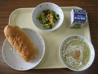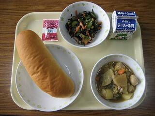 本日のメニューは、ご飯、牛乳、さけ磯の香りチーズフライ、レンコンのきんぴら、のっぺい汁でした。