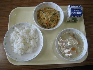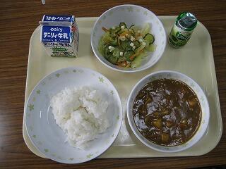 本日のメニューは、ご飯、牛乳、ポークカレー、チーズサラダ、ジョア(マスカット)でした。
