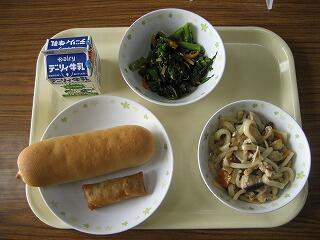 本日のメニューは、減量コッペパン、春の山菜うどん、春巻き、菜の花和えでした。