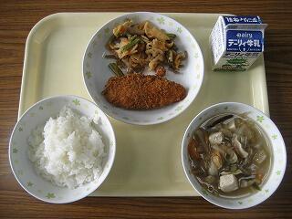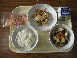 本日のメニューは、ご飯、牛乳、厚揚げの中華煮、中華和え、お祝いクレープでした。