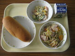 本日のメニューは、減量黒糖パン、牛乳、チャンポン(めん・具)、マセドアンサラダでした。