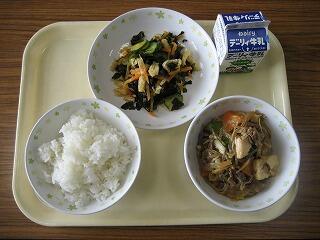 本日のメニューは、ご飯、牛乳、肉豆腐、きゅうりとわかめの酢の物でした。