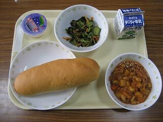 本日のメニューは、コッペパン、牛乳、ポークビーンズ、宮崎ちりめんサラダ、ブルーベリーゼリーでした。