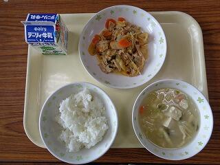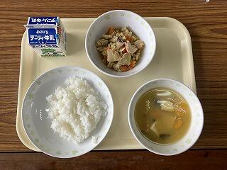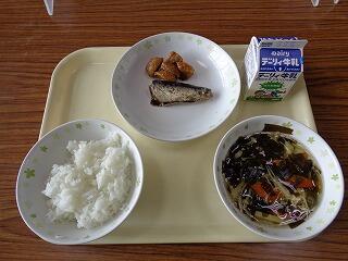 今日のメニューは、ごはん・いわしのしょうが煮・里芋のみそころばかし・若竹汁・牛乳でした。若竹汁に入っている三つ葉は宮崎県産です。