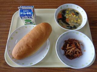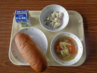今日のメニューは、黒糖パン・ミートボールのスープ・ポテトサラダ・牛乳でした。