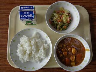 今日のメニューは、チキンカレー・グリーンサラダ・牛乳でした。カレーライスは、子どもたちの人気メニューです。