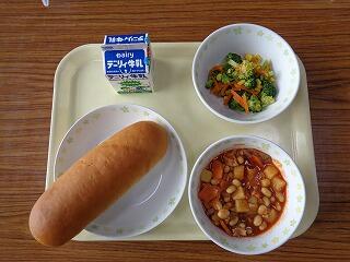 今日の給食は、ミルクパン・ポークビーンズ・ブロッコリーのサラダ・牛乳でした。