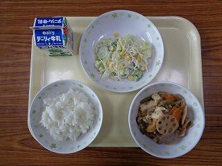 今日のメニューは、ごはん・筑前煮・春雨と春キャベツの和えものでした。春雨と春キャベツの和えものは、マヨネーズ味で子どもたちも食べやすいですね。
