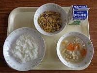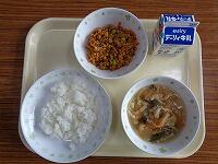 しろごはん、さといものそぼろ煮、豆乳みそ汁、牛乳