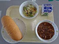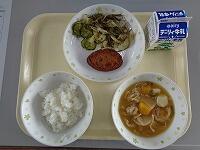 しろごはん、ドライカレー、チンゲンサイのスープ、牛乳