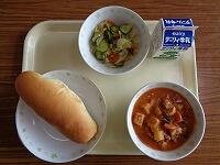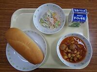 コッペパン、ミートボールと豆のトマト煮、はるさめサラダ、牛乳