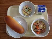 黒糖パン、牛肉コロッケ、ツナサラダ、いろどり野菜スープ、牛乳