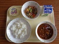 しろごはん、きのこのハヤシライス、千切り大根サラダ、ムース、牛乳