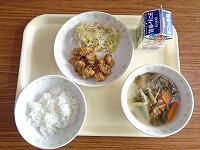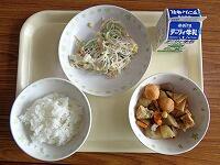 しろごはん、コロコロゆうりんちい、ゆで野菜、大根の味噌汁、牛乳