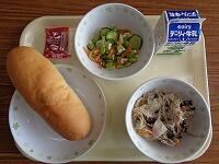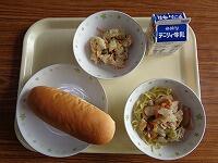 黒糖パン、牛肉コロッケ、ツナサラダ、いろどり野菜スープ、牛乳