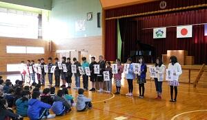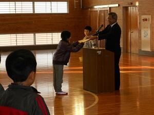 1月7日(水)は、3学期の始業式でした。式では、表彰のあと、校長先生が「One for all」「All for One」の気持ちをもって、1年間の締めくくりの3学期をみんなで協力してがんばって欲しいと話をされました。また、5年生が新年の抱負を書き初めで書き、その決意を発表しました。