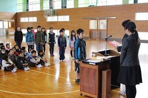 3月4日に予定していたお別れ遠足がインフルエンザのために延期になり、3月11日に実施されました。まず、体育館で6年生のための出し物を行い、次に全校児童で運動場を使っておにごっこをしました。校内での遠足になりましたが、みんなで楽しい思い出を作ることができました。