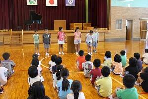 8月26日(金)は、2学期の始業式でした。欠席もなく、全員元気に登校してくれました。始業式では、3年生6名が2学期の目標を発表しました。計算や漢字、習字やリコーダー演奏をがんばりたいということでした。校長先生や生徒指導主事の話もあり、目標をしっかりもって運動や学習、生活等に取り組んでいく話に聞き入っていました。