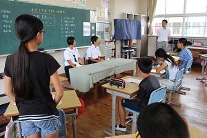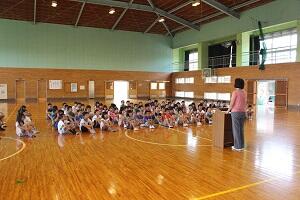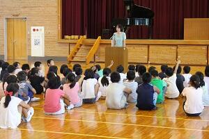8月3日(水)は、登校日でした。全校朝会では、校長先生から8/6と8/9、8/15の戦争についての話から命の大切さについての話がありました。また、係の先生からきまりを守って生活することについての話を聞きました。さらに、庄内地区一貫教育の取組として、今年も庄内中の1,2年生が6年生に中学校生活についてと題して話をしてくれました。