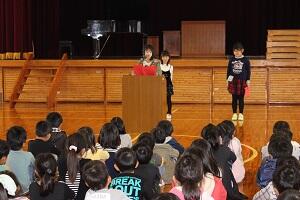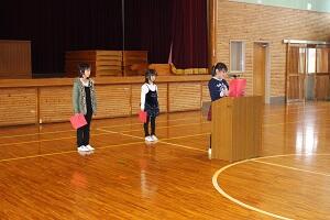 12月22日(木)は、2学期終業式でした。まず、2年生の代表児童3名が2学期がんばったことを発表しました。次に校長先生からのお話。生徒指導と健康に関するお話がありました。