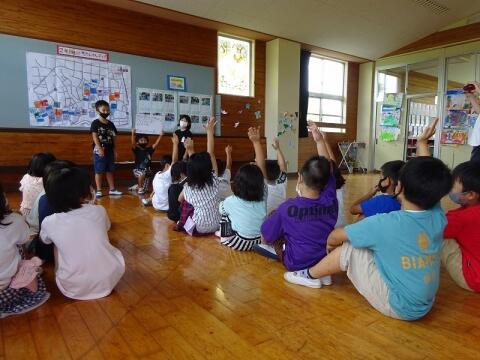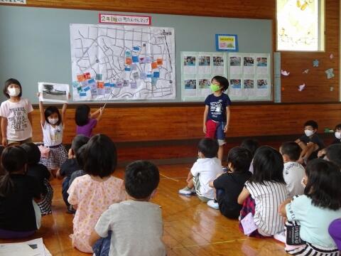 町たんけんで見つけたものや気付いたことなどを、写真や地図を使って1年生に紹介する活動を行いました。地区ごとにチームになって、施設やお店などを紹介した後、クイズも出しました。1年生のみんな、とても楽しく聞いてくれました。