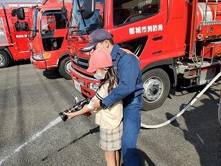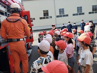 初めに都城南消防署へ見学に行きました。なかなか見ることのできない消防車の中や実際に使っている道具、はしご車などたくさんのものを見学しました。楽しく見学できました。