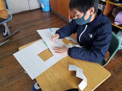 2年生では、学習の総まとめをプリント等で進めています。写真は、今年度学習した「図を使って考えよう」の復習に取り組んでいる様子です。