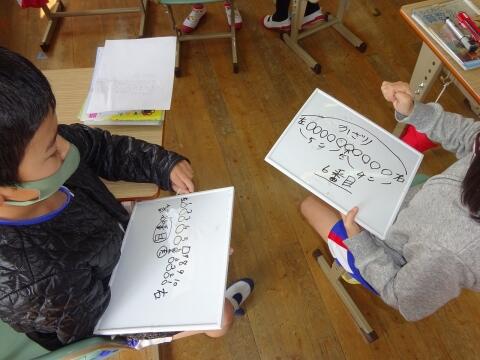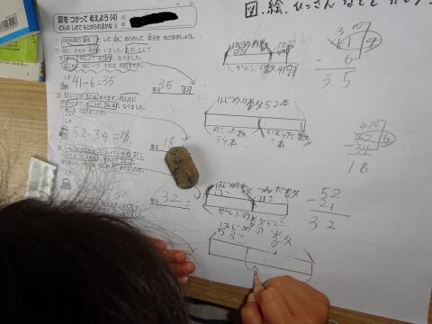 間違いをおそれず、それぞれしっかりと自分の考えを説明することができていました。友達のかいた図をみて「ここにこうやってかいた方がいいよ。」とアドバイスする人や、友達の意見を聞いて「あ!そうか!」と自分の間違いに気付く人など・・・一つ一つの姿から、2年生の子どもさんの大きな成長が感じられました。学習を楽しんでいるところもいいですね!