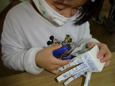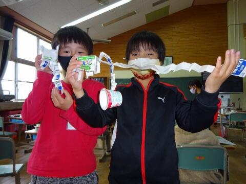 牛乳パックやヨーグルトのカップを自由に切り、ホッチキスでつなげて遊びました。2年生の子どもさんはほとんどが「ホッチキス初体験」だったので、使い方を最初に教えて、安全に気を付けながら取り組んでもらいました。