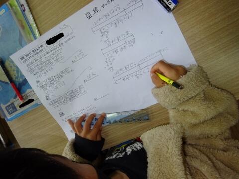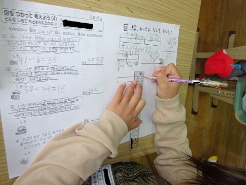 文章に書いてあることを一つ一つ確認し、テープ図に整理しながら式や答えを導き出しています。この姿だけを見ても、子どもさんにしっかりと力が付いている様子が分かりますね。