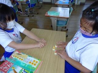 写真は、5個の数図ブロックを両手に隠して「いくつといくつでしょう?」ゲームを友達と楽しんでいる様子です。片手の方だけ見せると「あ!じゃあこっちは〇個だ!」と、考えながら取り組んでいました。