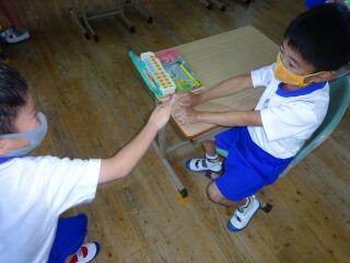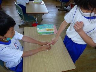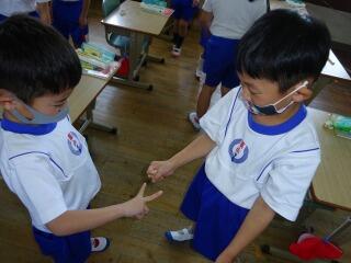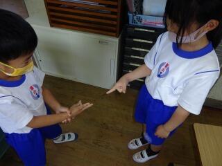 こちらは「5になるじゃんけん」です。1から4までの数を指で出し合い、二人合わせて5になったら「おめでとう!」というゲームです。大いに盛り上がった時間でした。