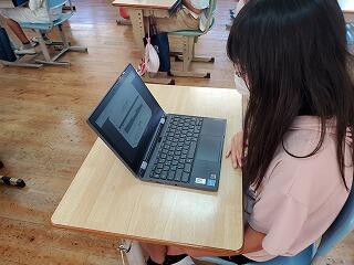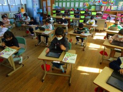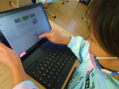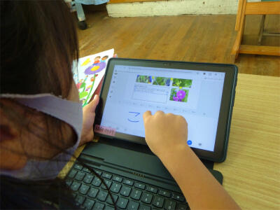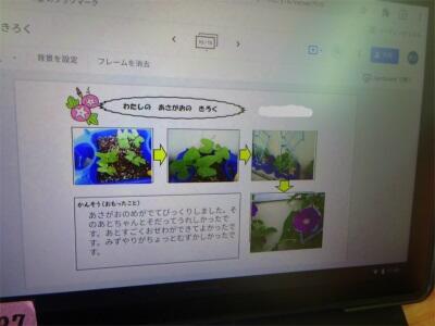 下の写真は、「ジャムボード」というソフトを使って、アサガオの記録カードを作っている様子です。これまでに自分で撮った写真を貼り付けたり、振り返りの文章を手書き入力したりして、カード作成に真剣に取り組みました。アサガオの成長過程やそれに対する自分の気持ちなどを、それぞれ上手に振り返ることができました。