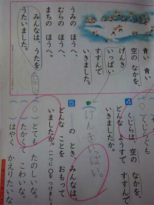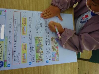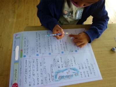 国語でも算数でも、大切なところに印をつけたりメモをしたりしながら、一つ一つの問題を丁寧に解いています。