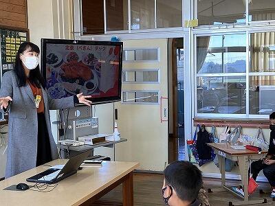 都城市の国際交流員の銭慧文(セン ケイブン)さんに、菓子野小学校に来ていただき、中国の食べ物や文化について授業をしていただきました。