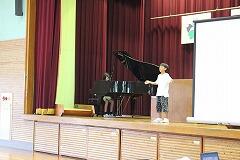 今日から2学期の始まりです。始業式では、2年生の代表児童が、算数のかけ算や筆算などの学習面、廊下歩行や元気よいあいさつなどの生活面について、自分の決めた目標をしっかりと発表しました。校長先生は、8月8日に起きた地震を振り返り、『命を守る3』について話しました。学校で地震が起きた場合のアニメーションを見て、『命を守る3つのポーズ』を学びました。机のない体育館では、『ダンゴムシのポーズ』で頭を守ることを全員で実践しました。そして、地震が起きたときには、素早く命を守る行動ができるように確認しました。