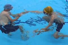 14日(金)3~4時間目に最後の学年部(3・4年生)がプール開きを行いました。これですべての学年がプール開きを終えることになります。金曜日は大変天気がよく、画像からもわかりますように大変気持ちのよい中での学習になりました。バディによる安全確認を学習活動の節目ごとに行っていました。そのバディ同士で手をつなぎ二人で一緒に浮く活動を行っていました。相手が手を握ってくれているので、安心して浮くことができました。その後、隣の二人組と一緒になり4人で浮く活動をすると息がぴったり合い体から自然に力が抜けているように見えました。浮く喜びが自然と高まり6人で浮いているグループも出てきました。思わず拍手を送りました。